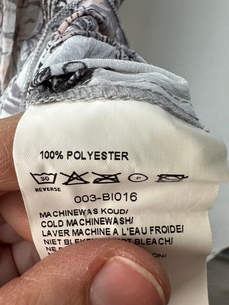 Mooie blouse, met ronde hals met een klein rond boordje. De blouse wordt geleverd inclusief een bijpassend sjaaltje. Er zijn weinig tot geen gebruikssporen te zien.