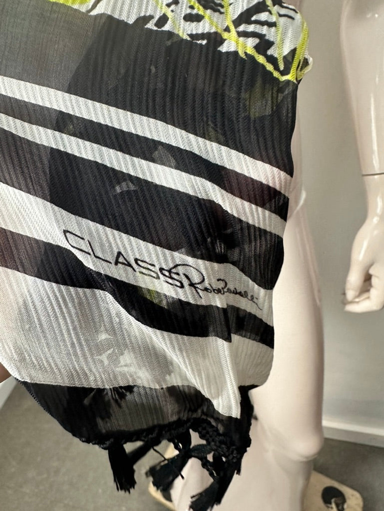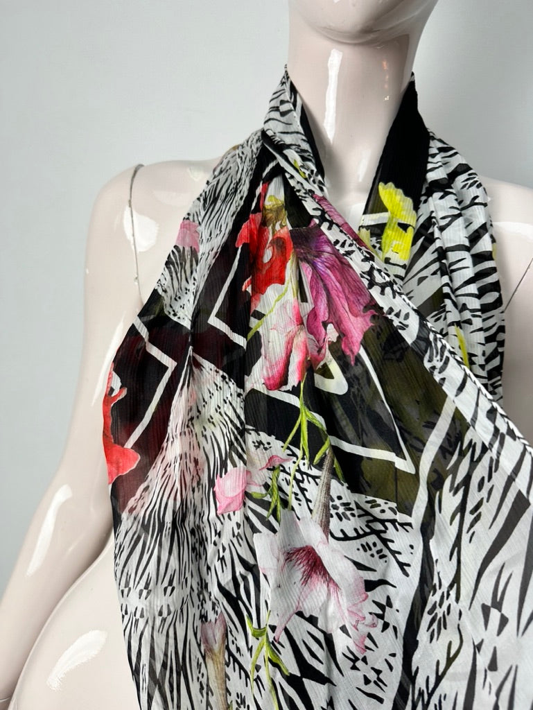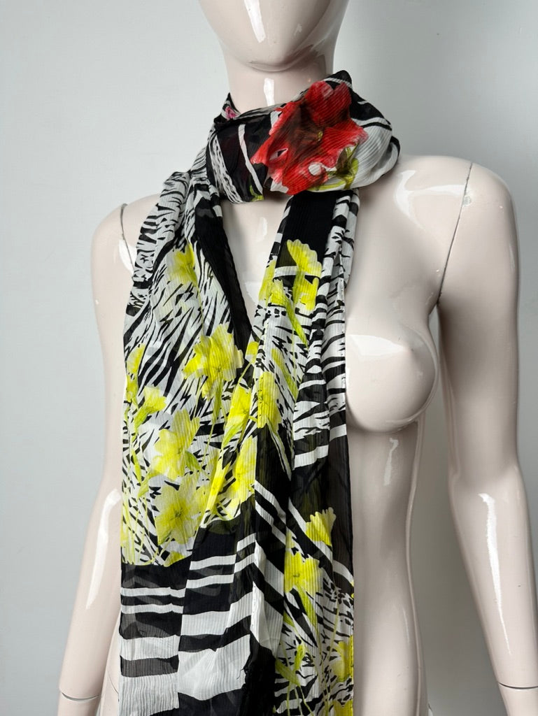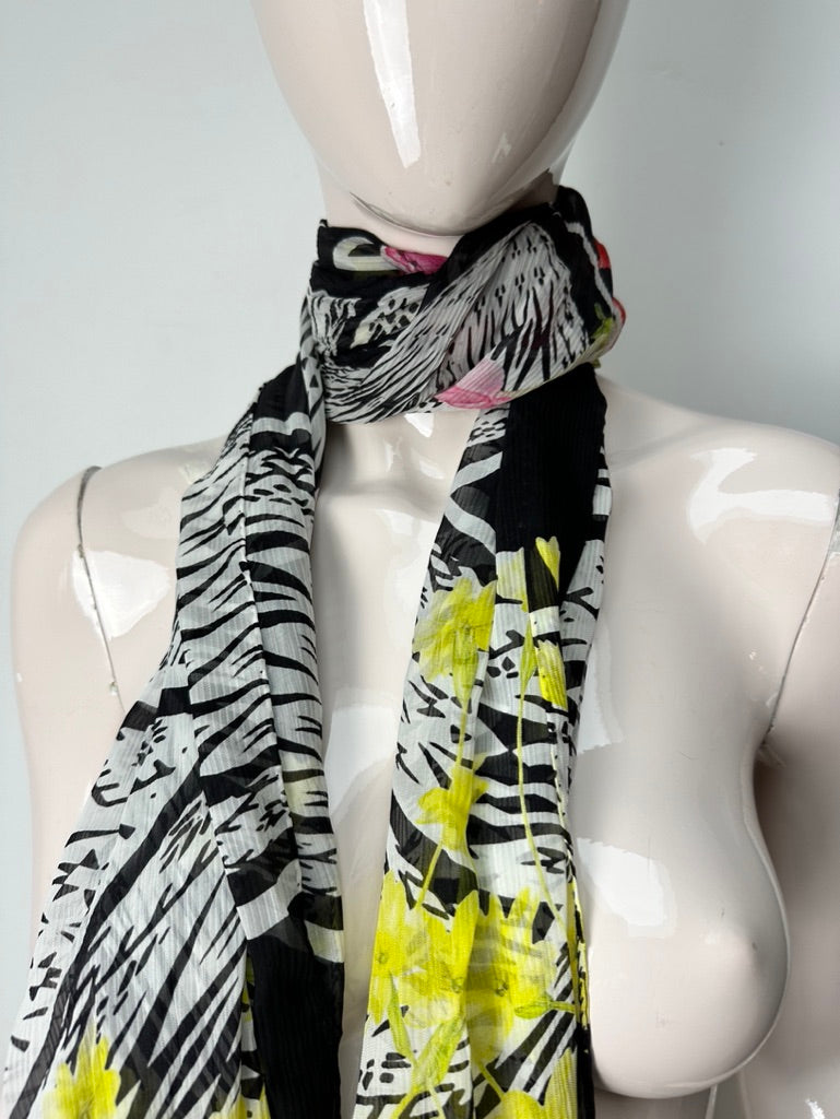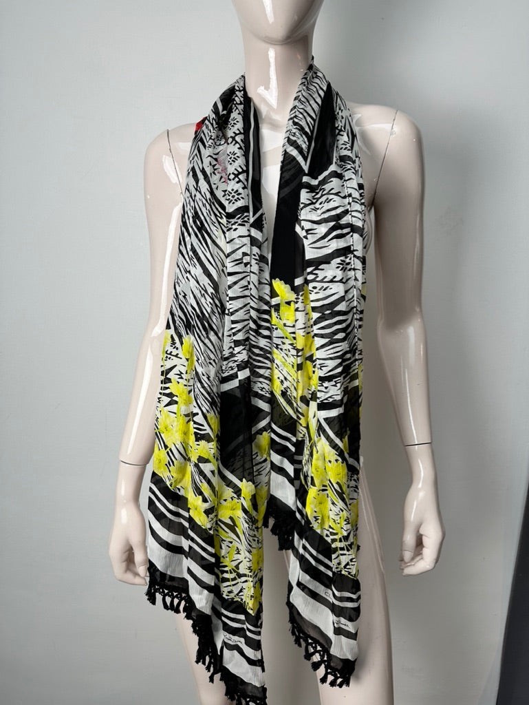 Dunne voile sjaal met fringe aan de onderkant, langwerpig model met in het midden gekleurde bloemen die uitlopen naar gele narcissen en een zwart/wit motief.