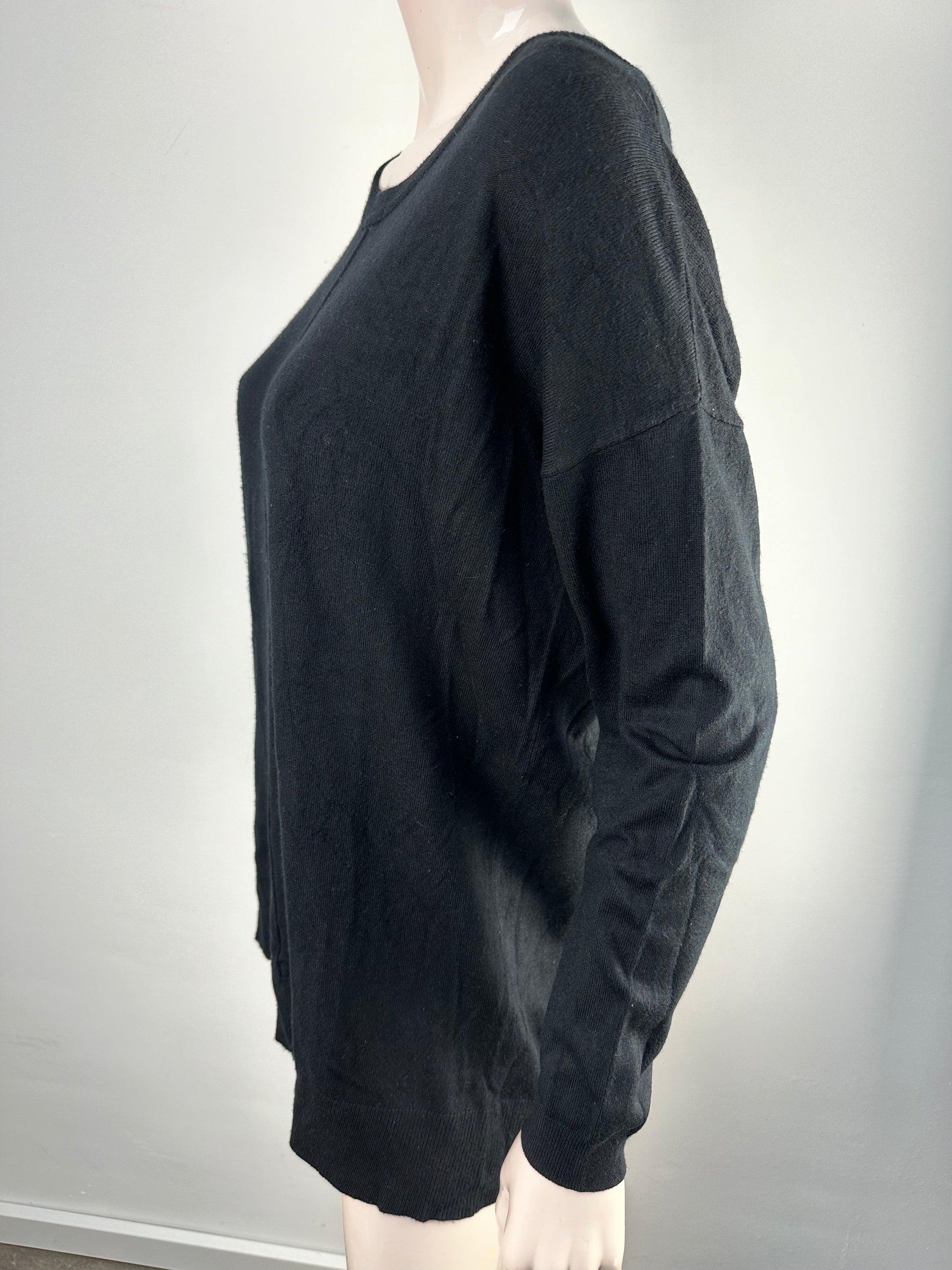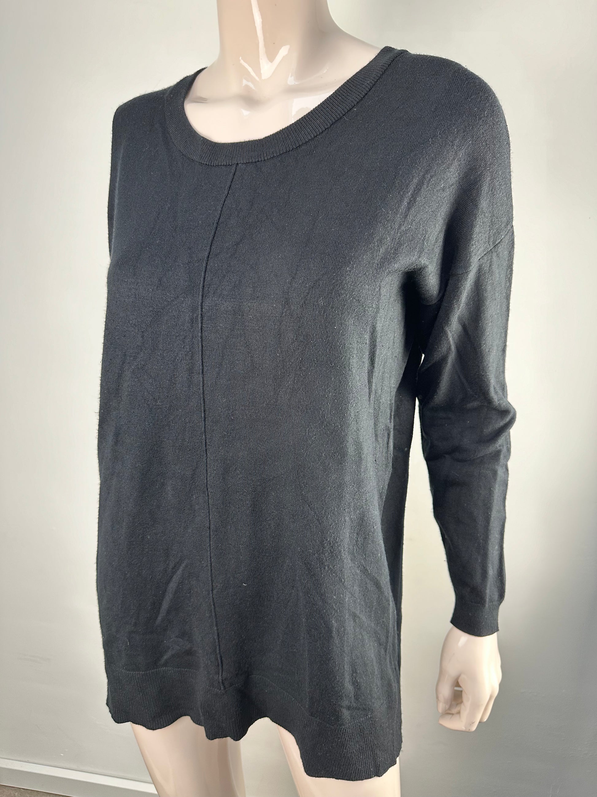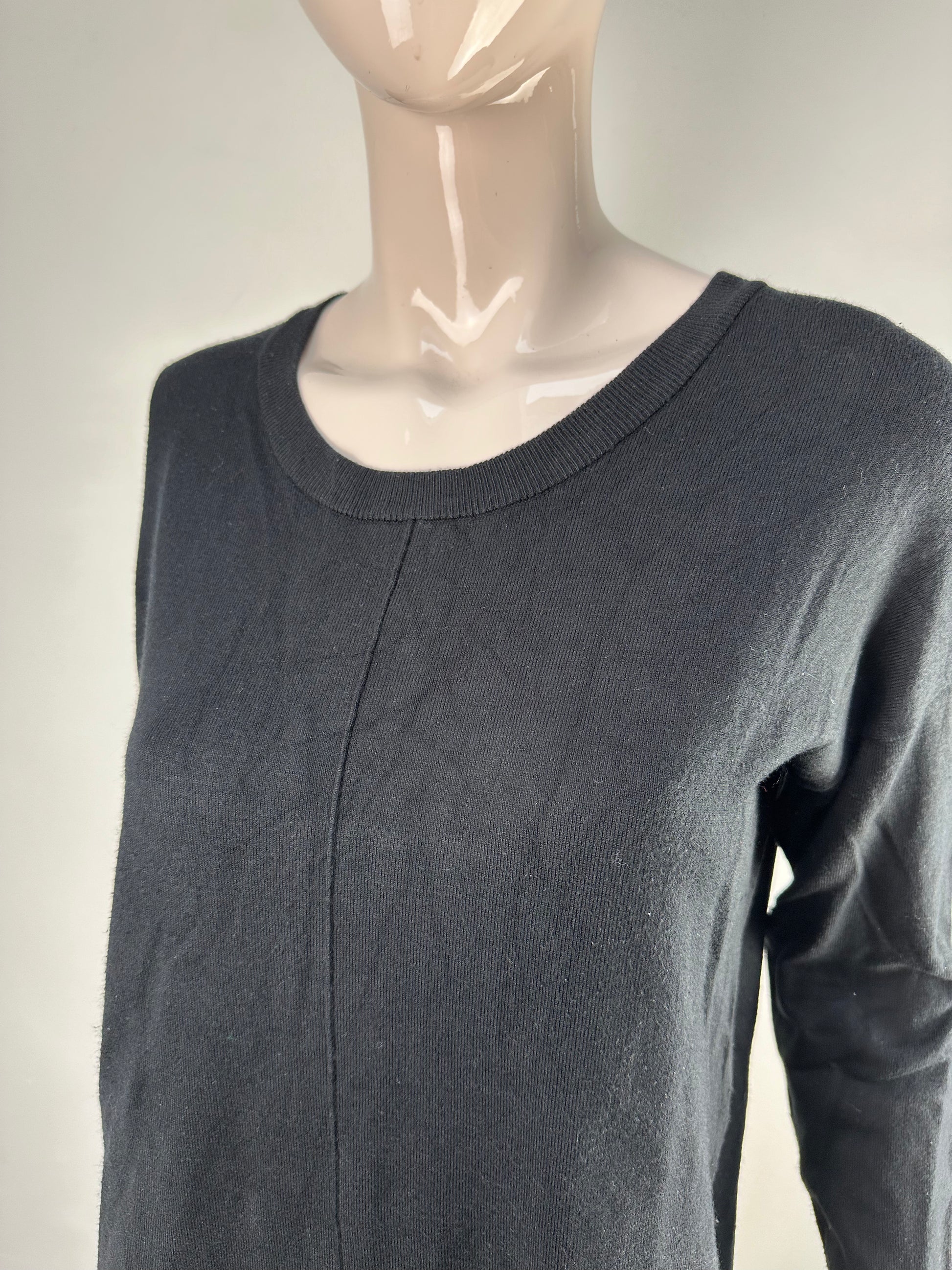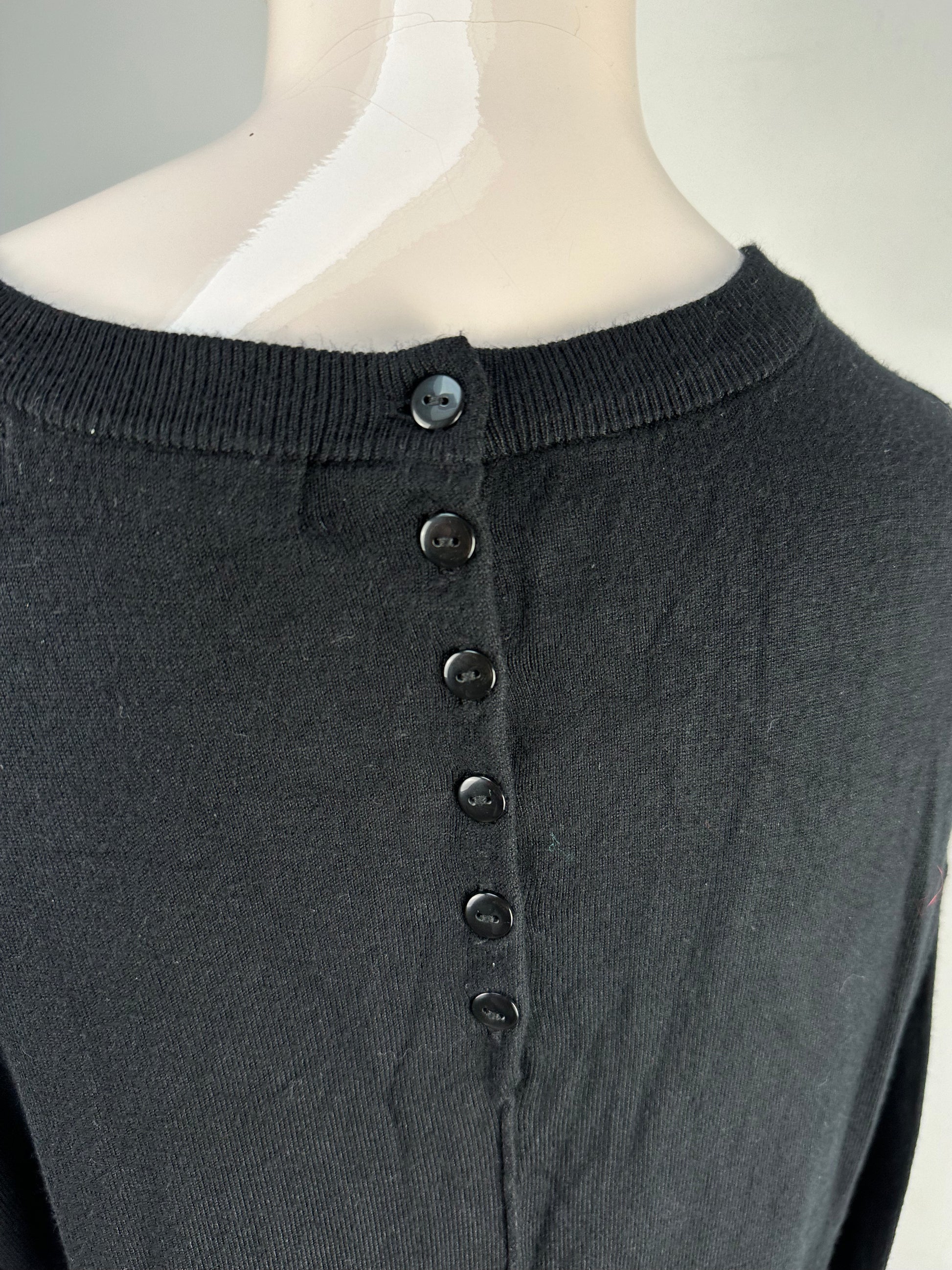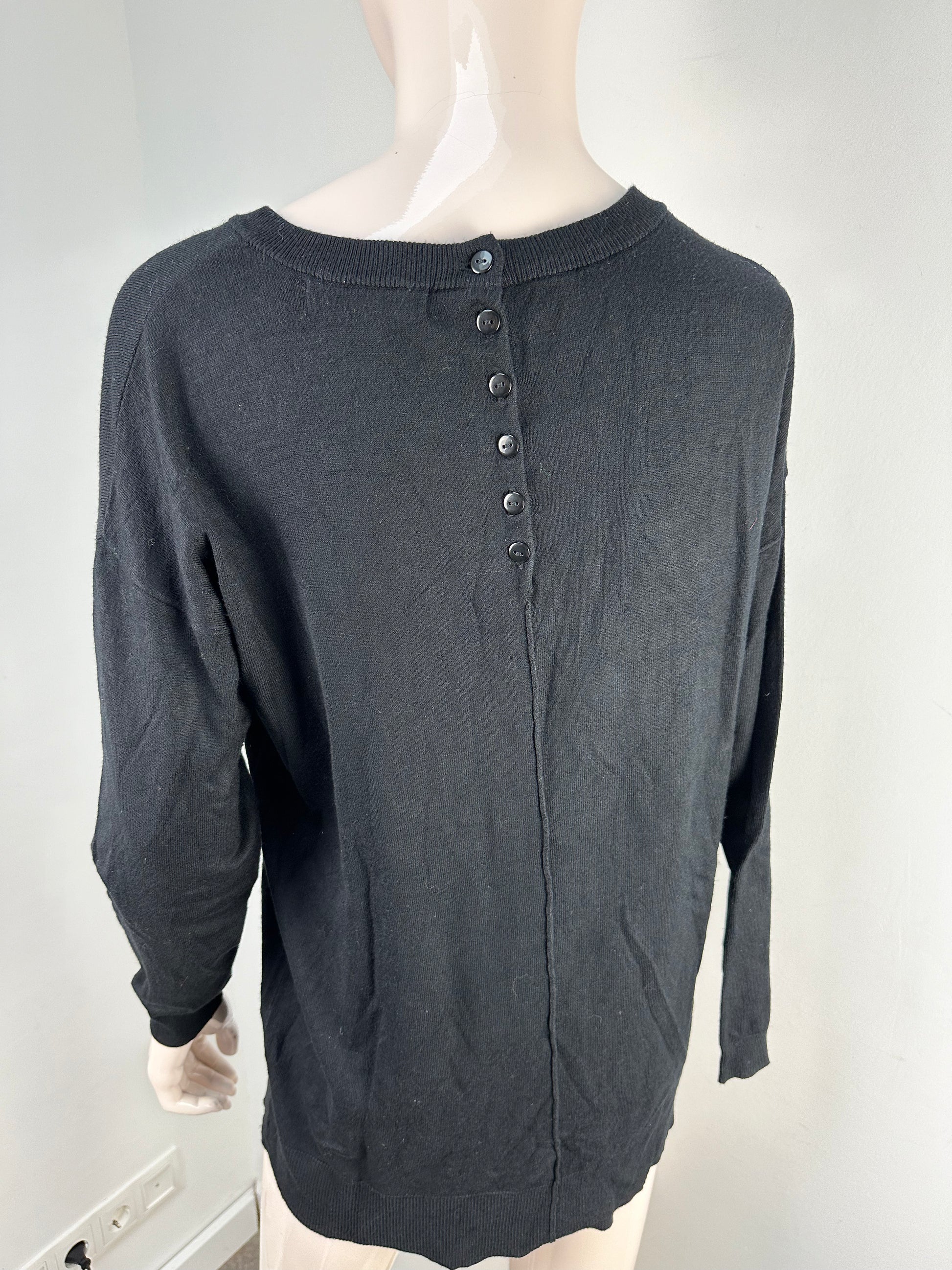 Zwarte trui met ronde hals en knoopjes op de achterkant. Boordjes aan de mouwen en onderzijde, een decoratieve ribbel over het midden op de voorzijde.