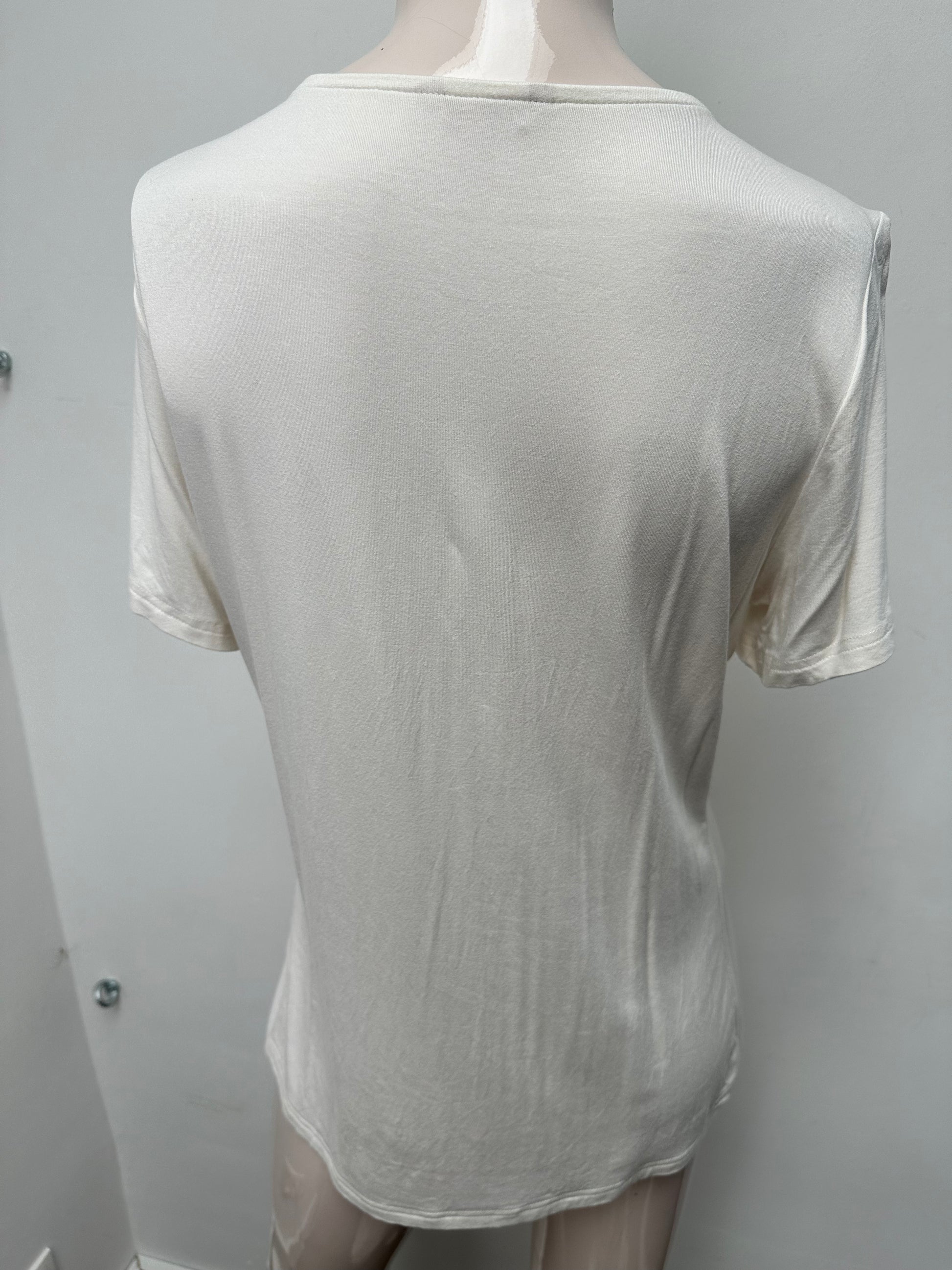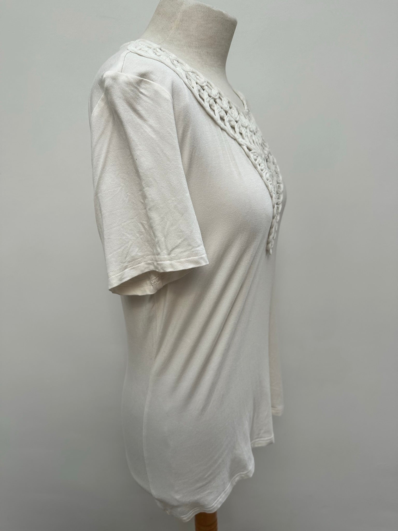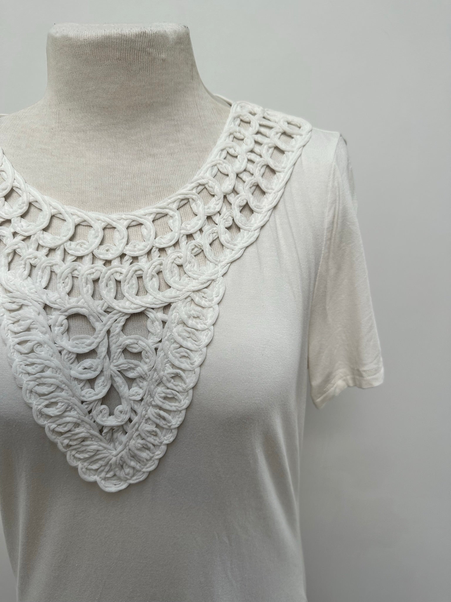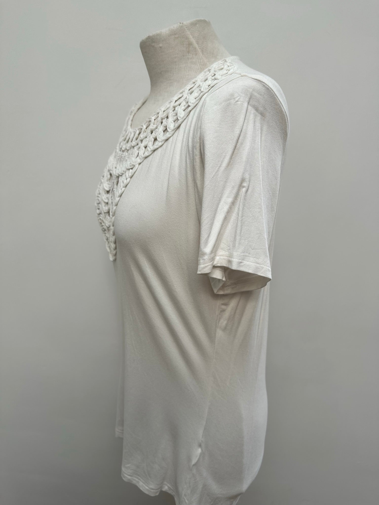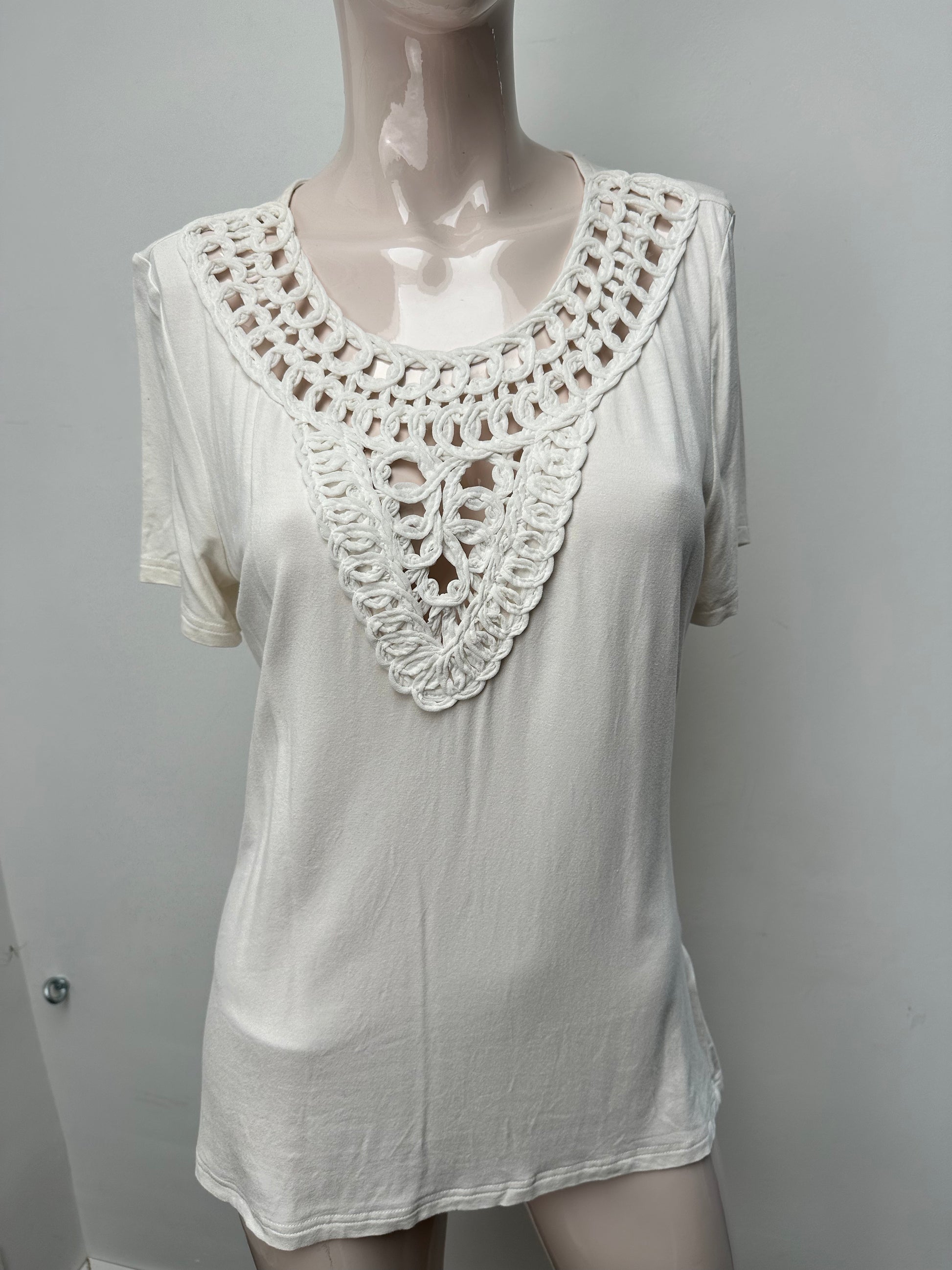 T-shirt met korte mouwen en losse fit. De bovenkant is in boho-stijl opengewerkt en staat super onder een colbert. In zeer goede staat.
