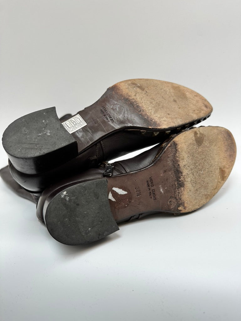 Op zoek naar een uniek paar laarzen dat zowel stoer als stijlvol is? Dan zijn deze Gianfranco Ferré donkerbruine laarzen in maat 38,5 perfect voor jou. Met hun opvallende gespen en studs zijn ze een echte eyecatcher. De laarzen zijn gedragen, maar zien er nog steeds zeer goed uit, met slechts lichte gebruikssporen (één stud is verdwenen).
