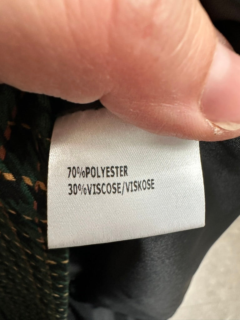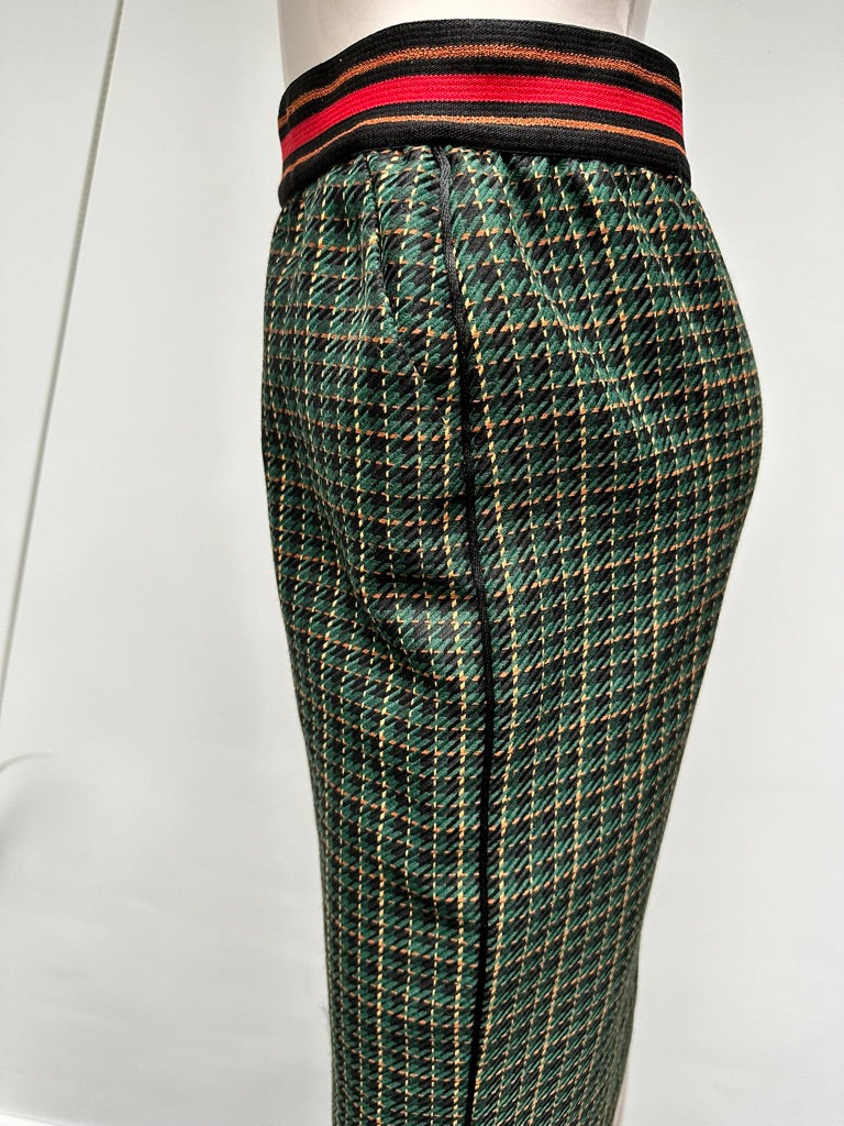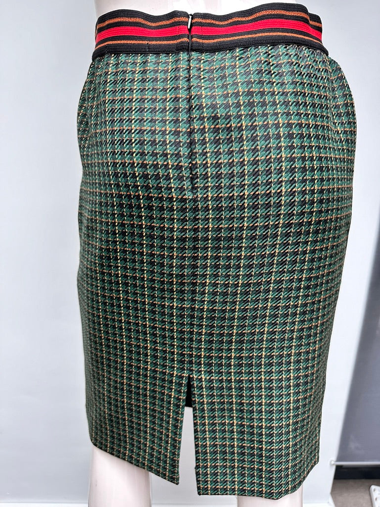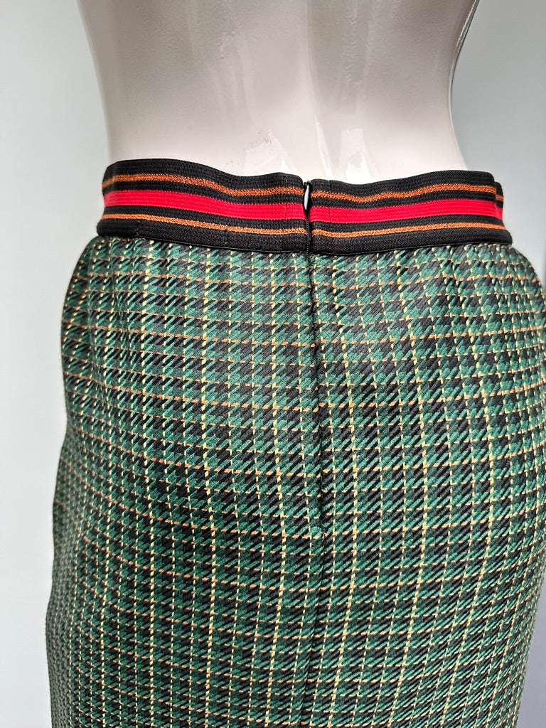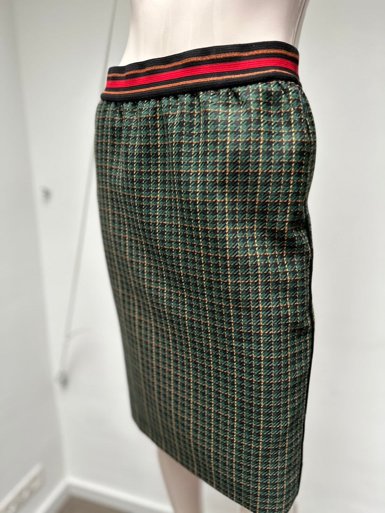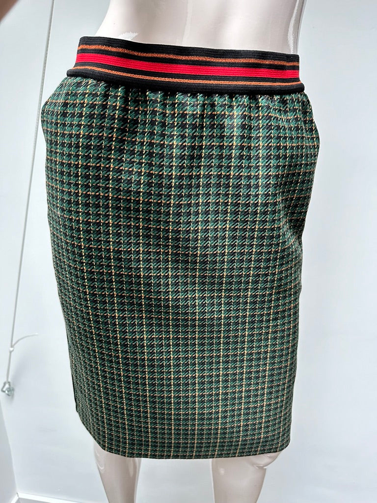 Mooie rechte rok in subtiel donkergroene ruit, afgewerkt met een gestreepte tailleband. De rok is zo goed als nieuw.