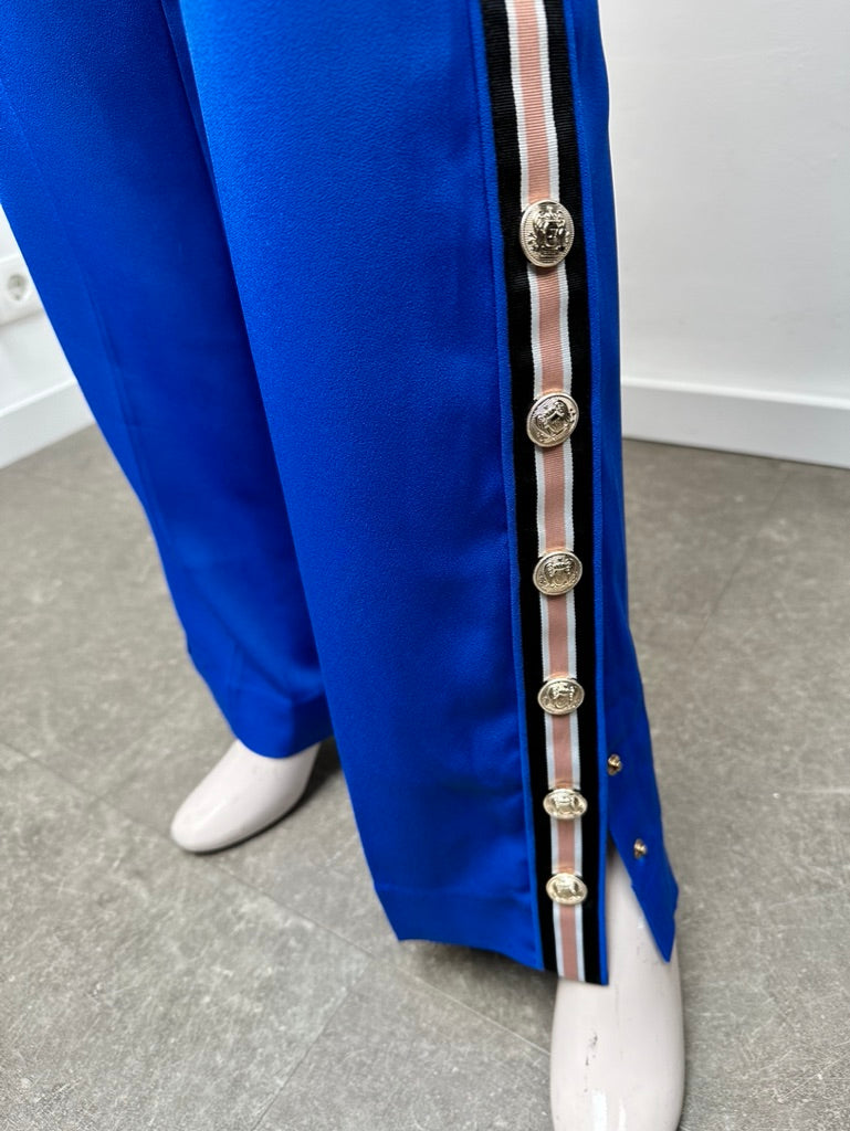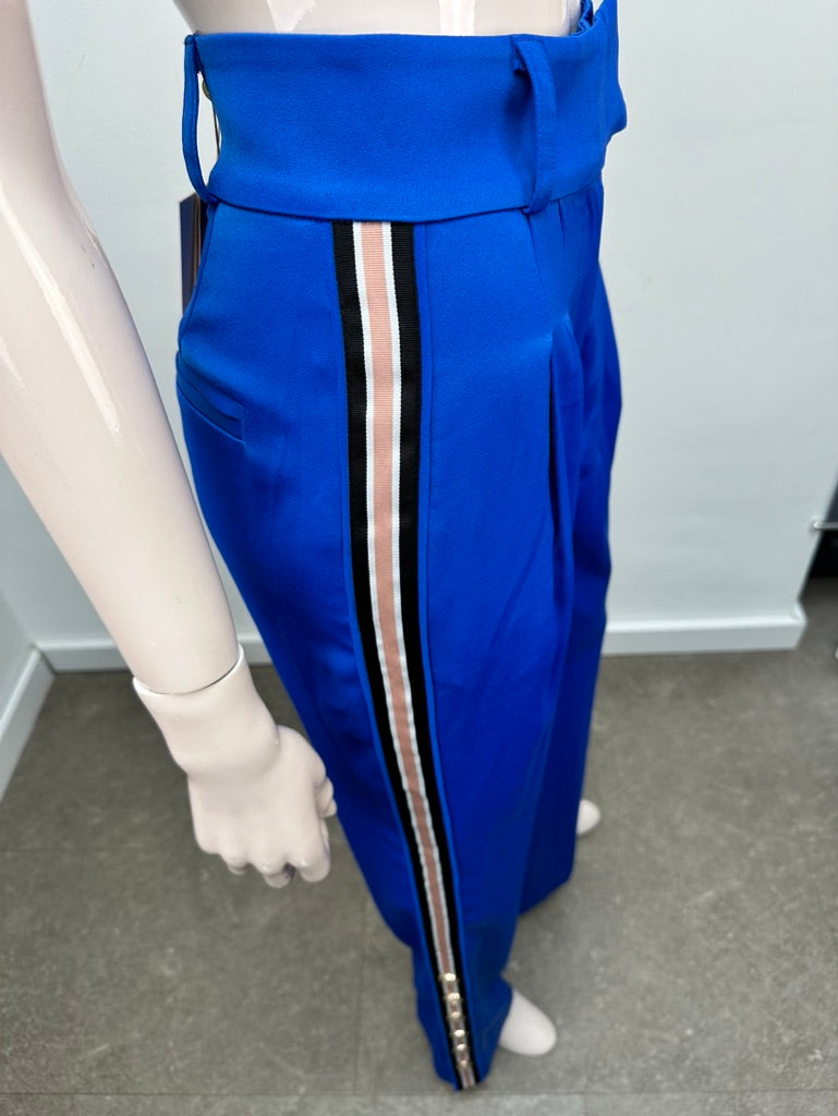 Toffe broek met wijde pijpen en piping, onderaan voorzien van knoopjes, dus ook open te dragen. De broek is geheel nieuw met originele prijskaartjes.