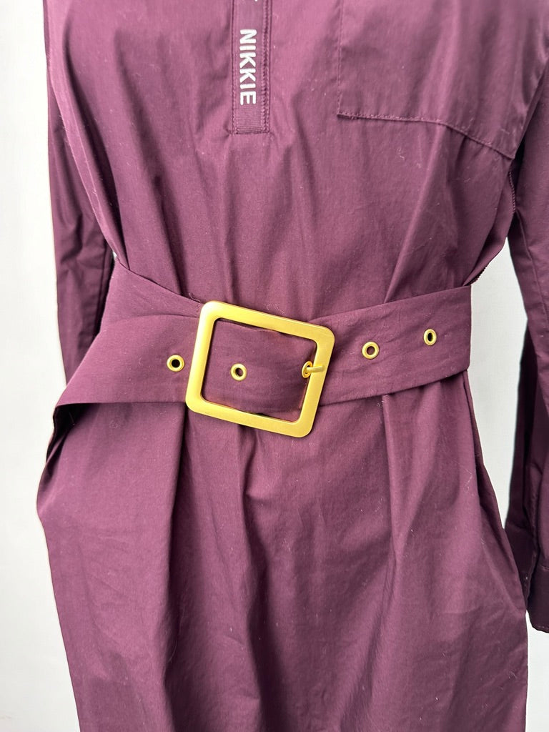 Op zoek naar een uniek en stijlvol jurkje? Dan is dit Nikkie bordeaux rood jurkje in maat 32 echt iets voor jou! Dit prachtige jurkje heeft leuke overhemd details en een riem met een gouden gesp, wat zorgt voor een elegante uitstraling. En het beste van alles? Het jurkje is in zeer goede staat en past ook goed voor maat 34-36. Zo hoef je je geen zorgen te maken over de pasvorm.
