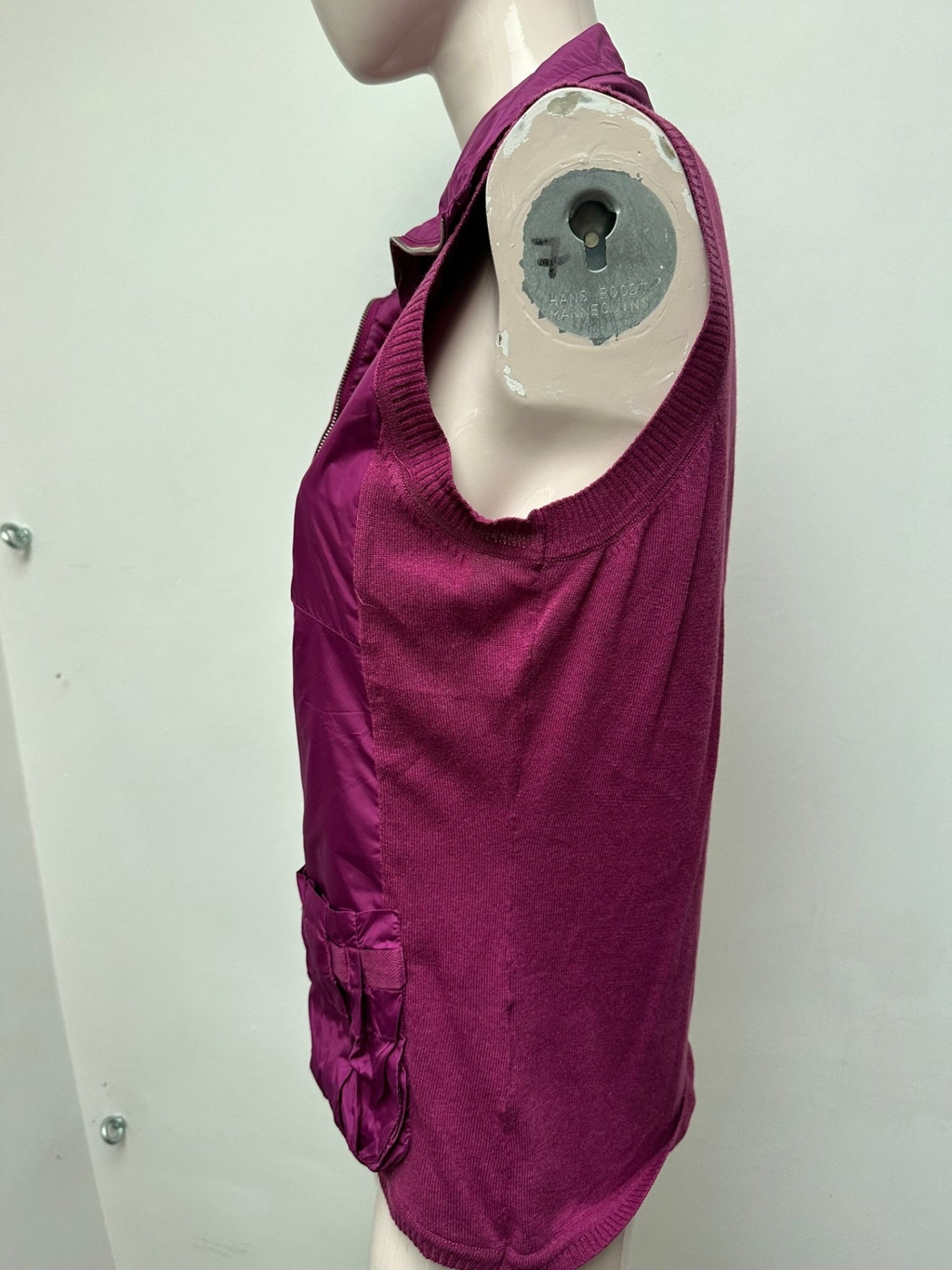 De Taifun Bodywarmer maat 40 paars is een uniek kledingstuk dat je niet snel ergens anders zult vinden. Deze bodywarmer heeft een prachtige achterkant met een wollen optiek, waardoor het een luxe uitstraling heeft. Het item is zo goed als nieuw en is perfect voor de koudere dagen.
