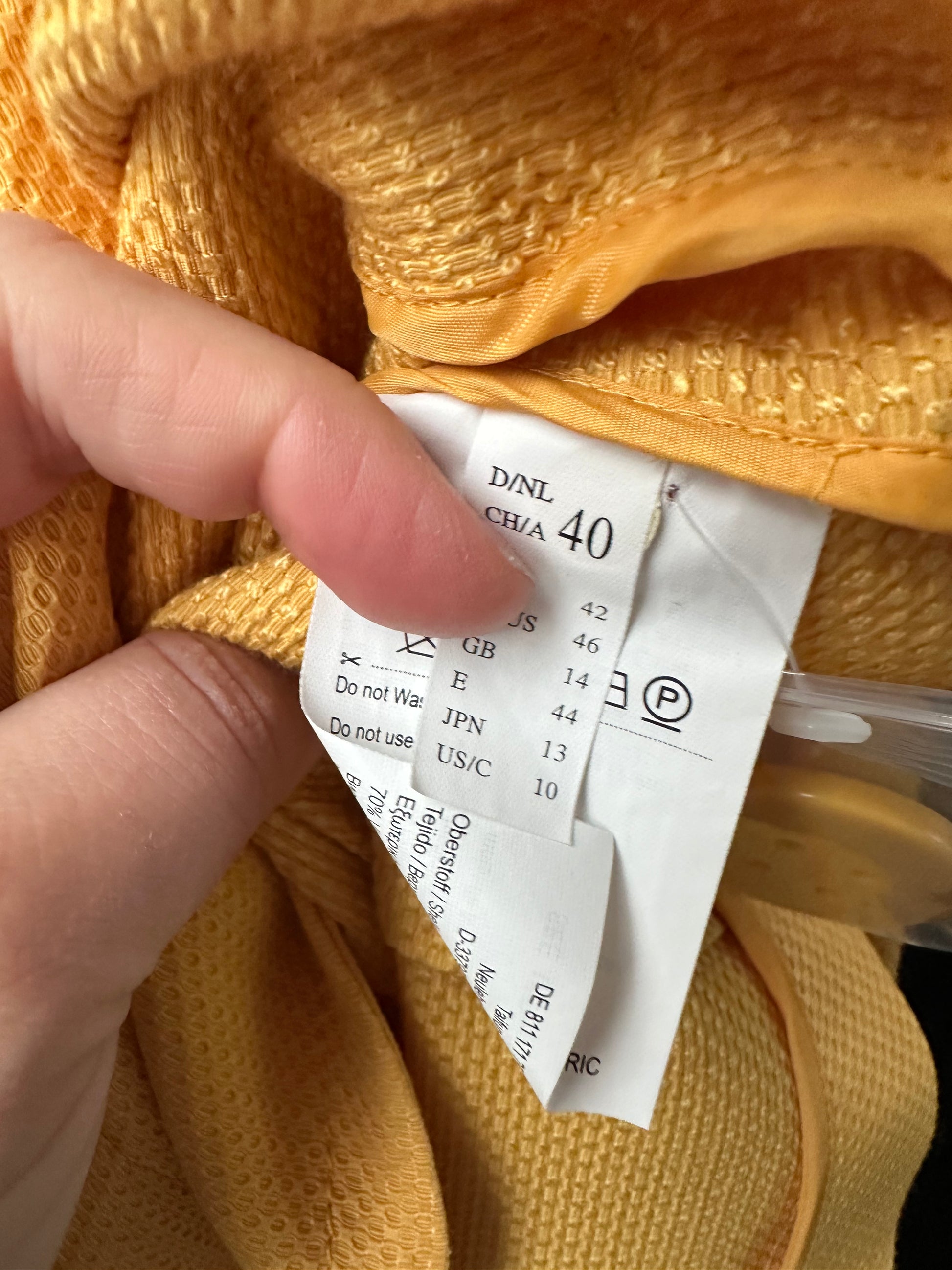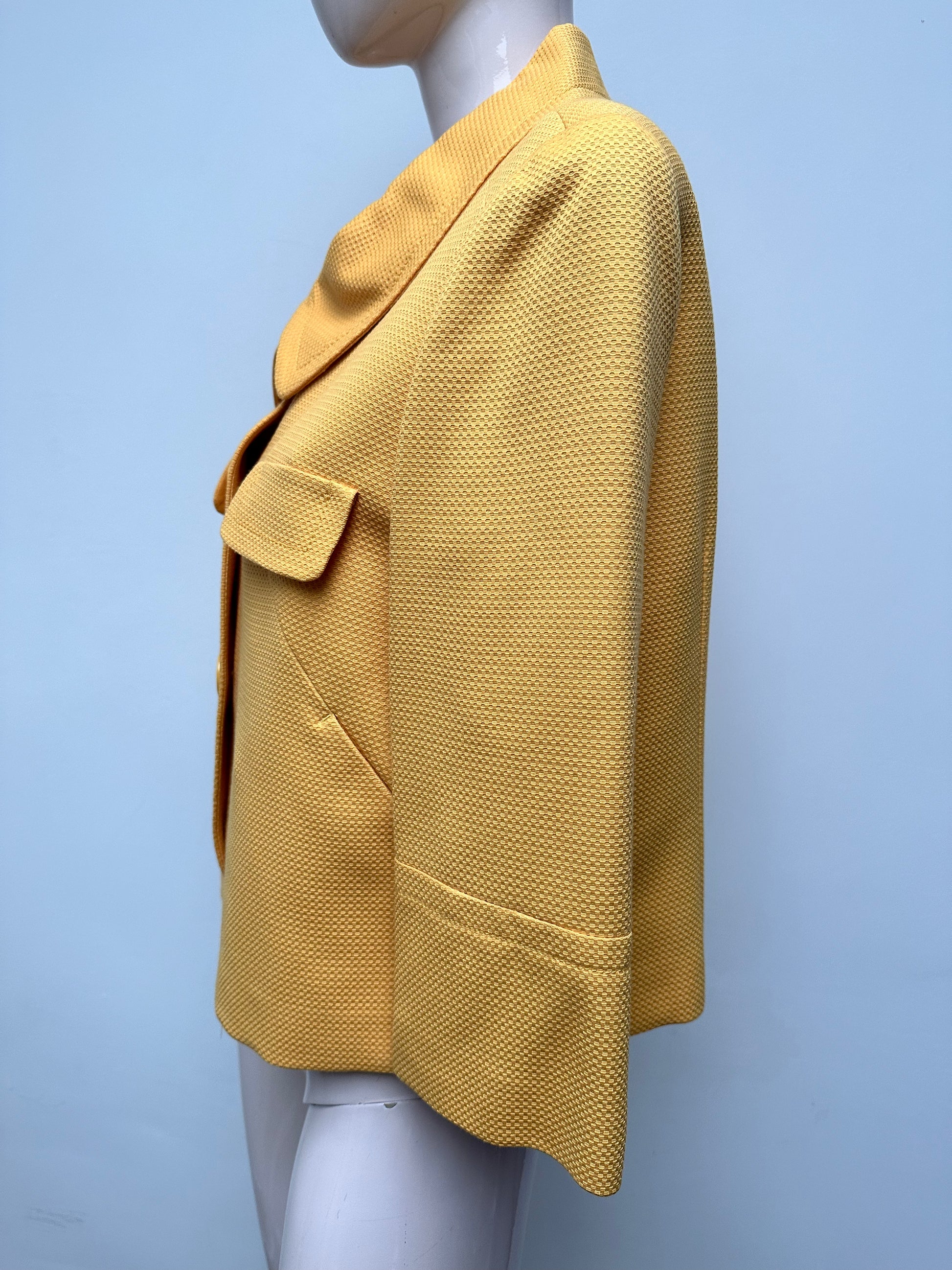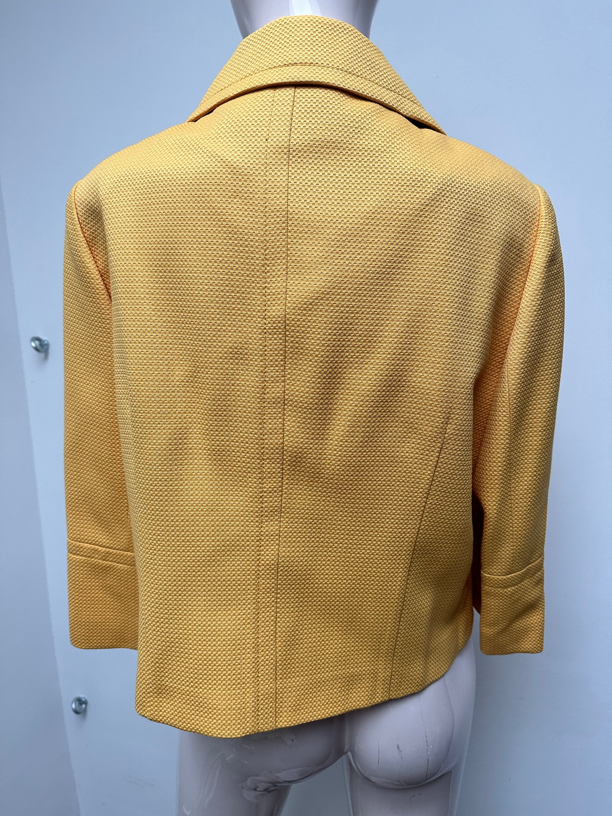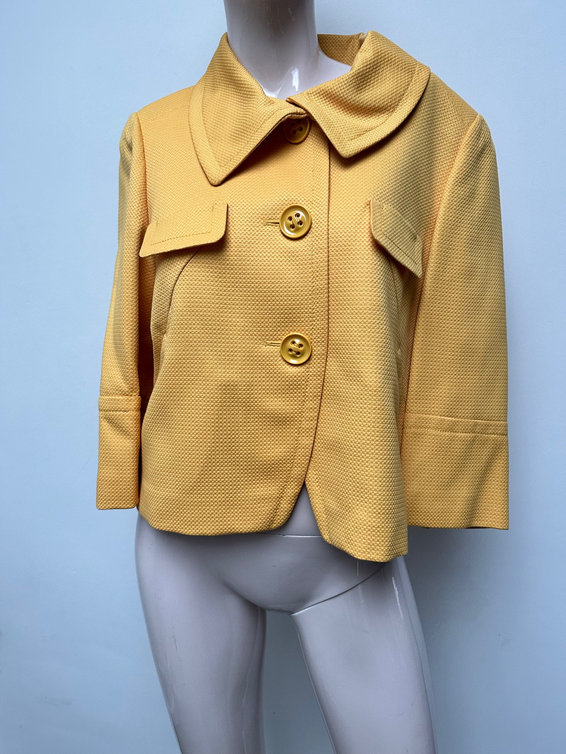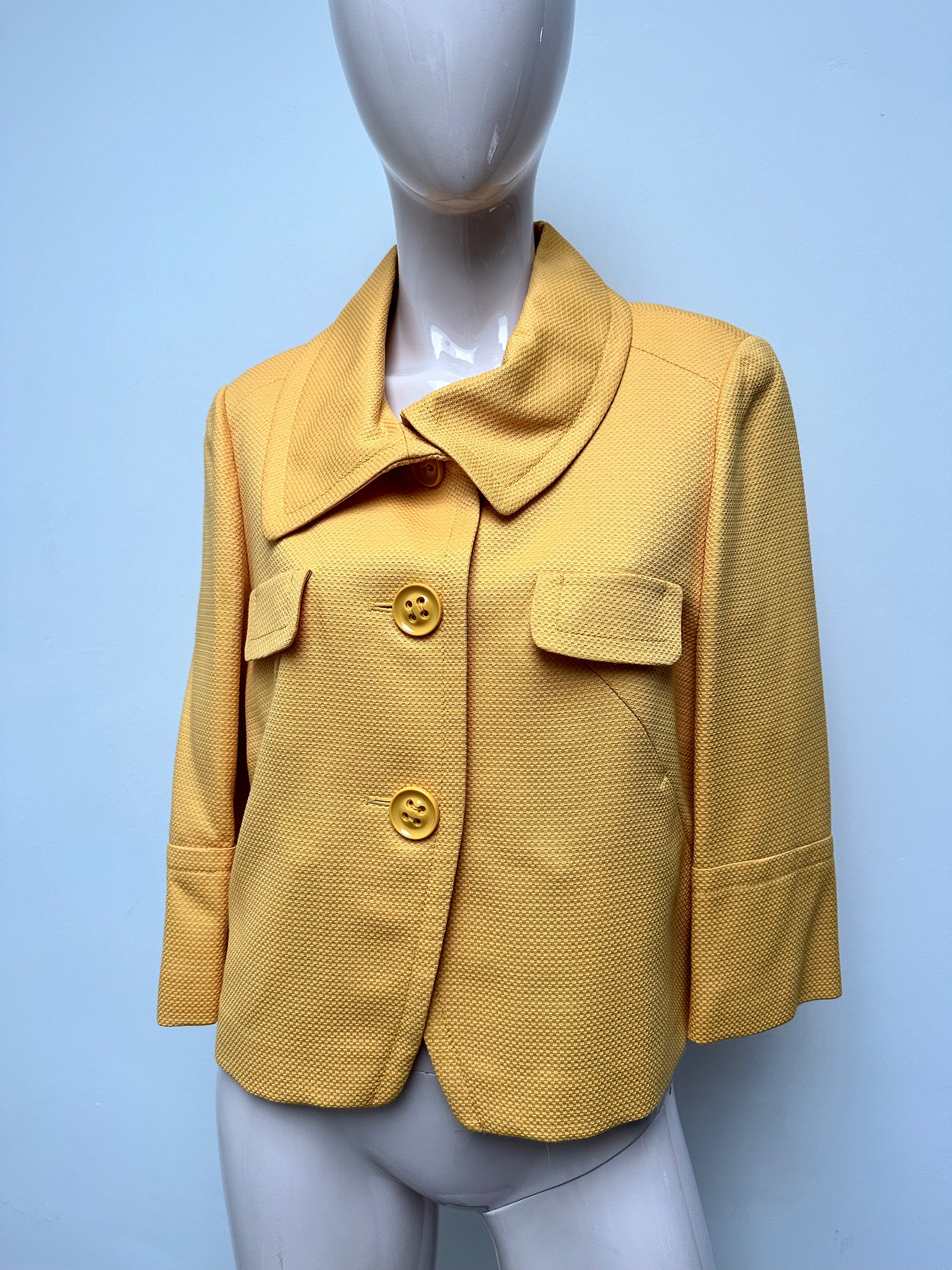 Introducing the Taifun Colbert maat 40 geel, a unique and stylish jacket in the iconic Jackie O style. This beautiful piece is in a warm yellow shade and is in excellent condition, making it a must-have for any fashion-forward individual.