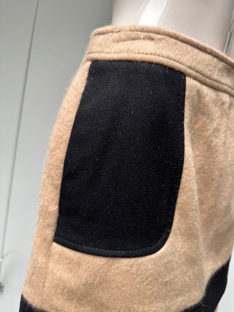 Apart beige rokje van wol met zwarte details. De rok is licht uitlopend, niet elastisch en sluit met een rits achterop.
