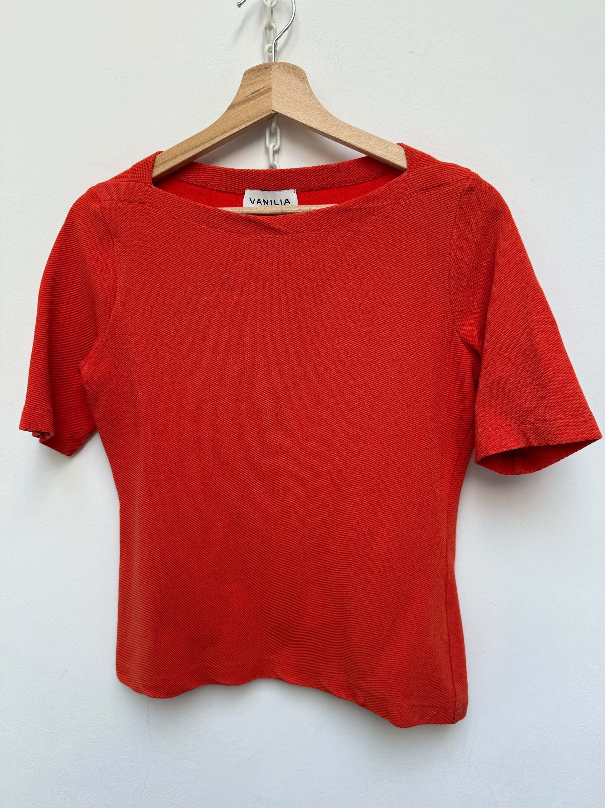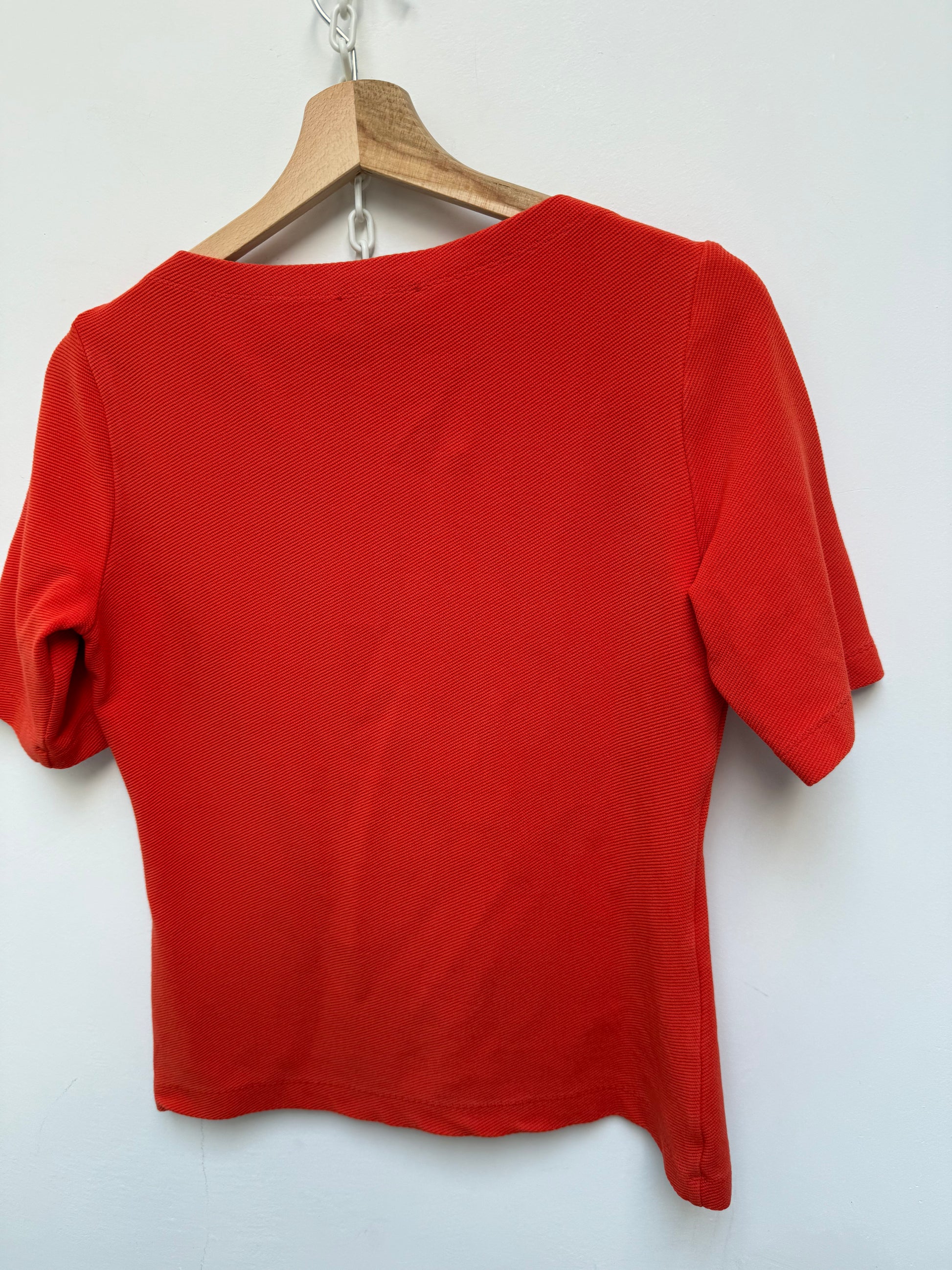 Leuke top met korte mouw en boothals, ziet er nog erg goed uit.
